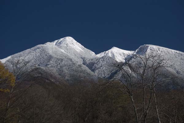 天狗岳(左)、箕冠山、根石岳も白い峰となった。