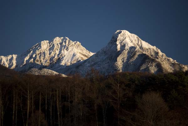 赤岳(左)と阿弥陀岳(右)は夕日を浴びて薄くオレンジ色に染る。