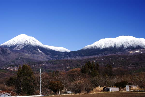 蓼科山(左)と北横岳(右)はたおやかな白い尾根と見せている。