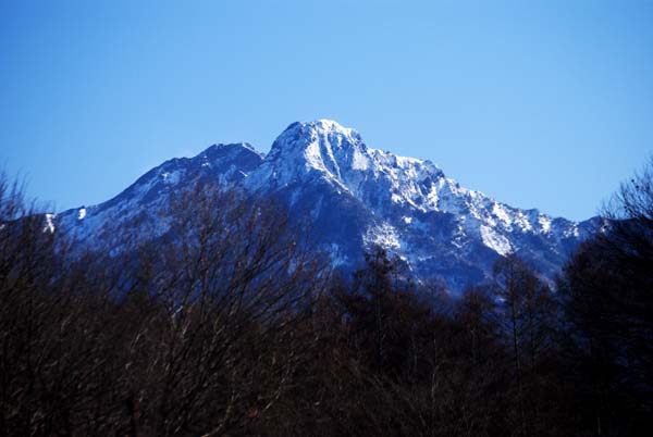 霧ケ峰の背後に顔を出した岩と雪の殿堂穂高連峰。前穂高岳東壁が真正面に見える。