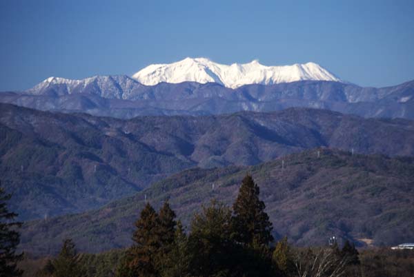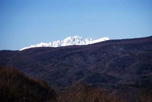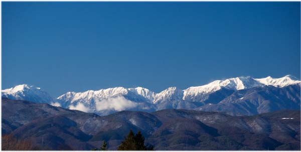 蓼科高原からは、日本アルプスの山々が白く輝いて見える。木曽駒ケ岳(右端)から空木岳(左端)へと続く中央アルプスの山々。