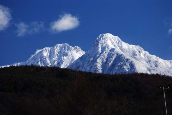 山麓から見上げる赤岳(左)と阿弥陀岳(右)が白く輝いている。