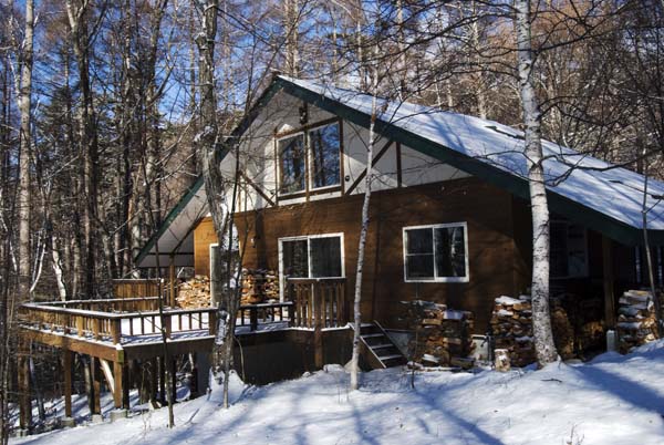庭先の落葉松の林の背後には、白い中央アルプスが望まれる。