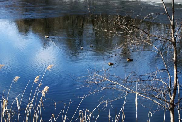 日当たりの良い池の南側は、氷も溶けてここを寝ぐらにしている鴨がじっとうずくまっている。