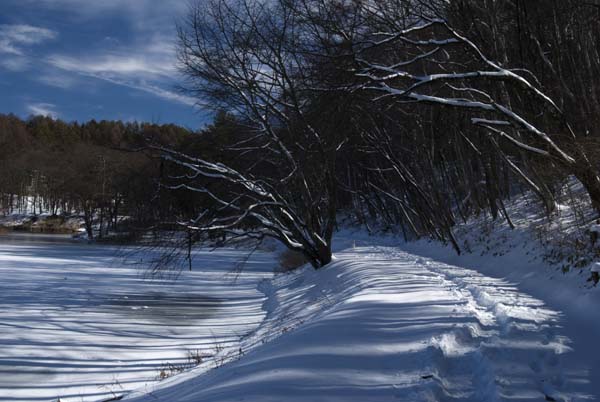 近くの竜神池に出かけてみると、北側の散歩道は、雪道となっている。