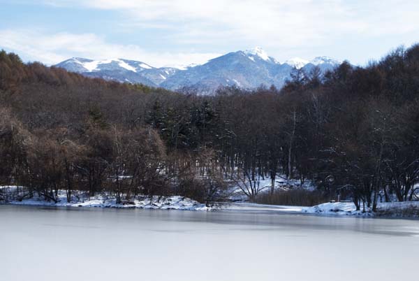 湖面は、薄く氷り、遠く八ヶ岳連峰が白く輝いている。
