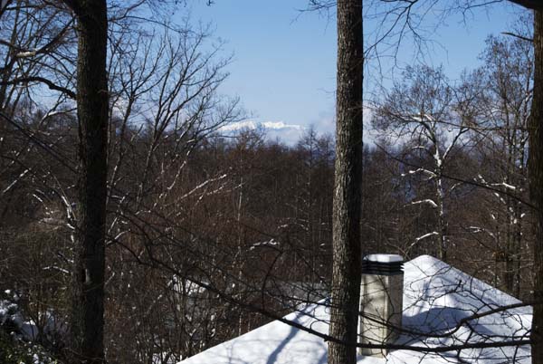 我が家の森の背後には、中央アルプスの白い山並みが望まれる。