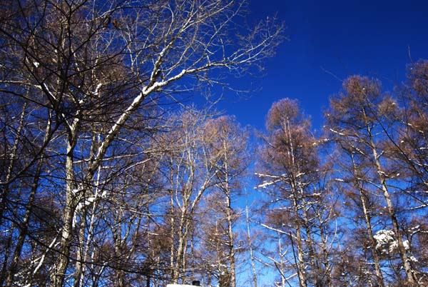 屋根の上には、背の高いカラマツの梢の先に青空が広がる。