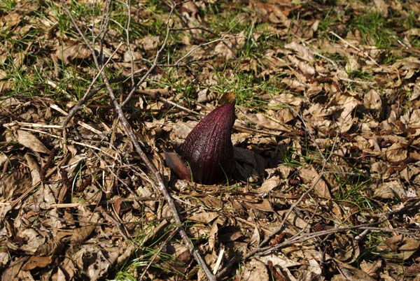 湿地では、座禅草が独特の形の芽を出し始めた。