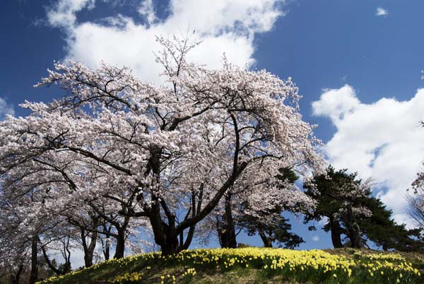 室内公民館の丘では、水仙が咲き、その上に桜が咲き誇っている。