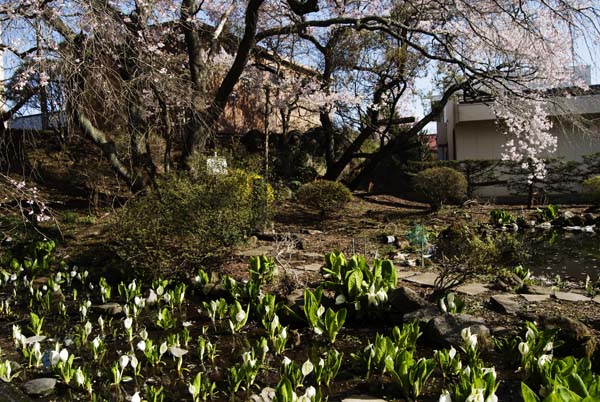 寺の庭の水芭蕉も一斉に白い芽を出している。