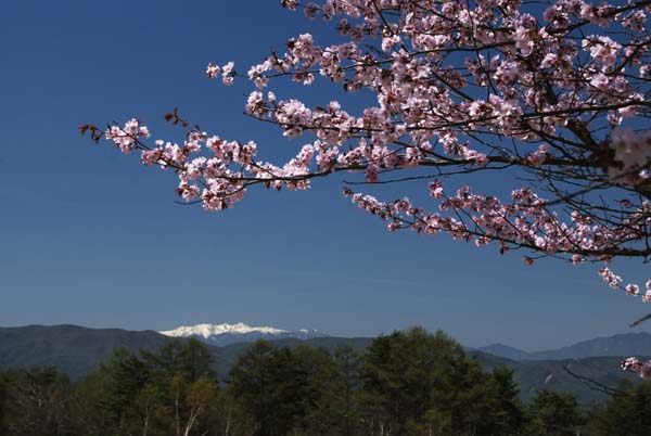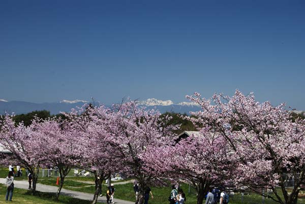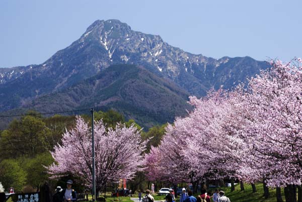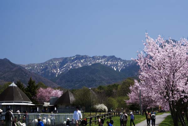 原村の八ヶ岳農場の桜がようやく満開となった。暖かい日差しの下、大勢の人で賑わっている。