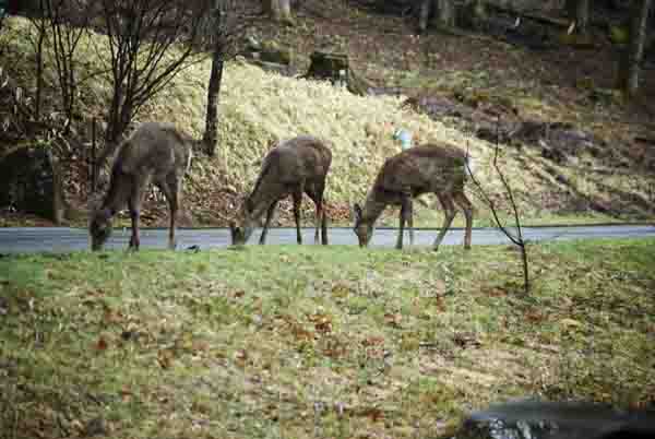 夕方、我が家の玄関先では、山から降りて来た鹿の一軍が新芽を一心に突いている。