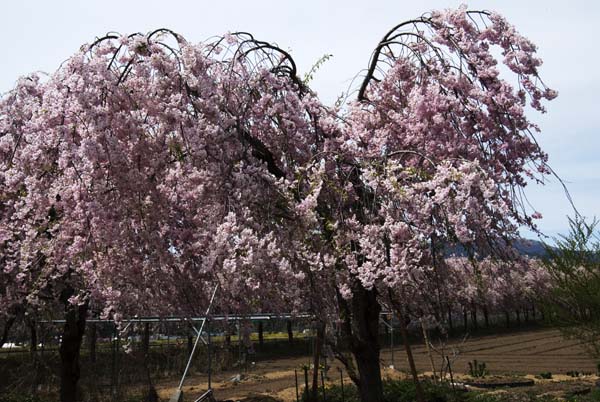 八ヶ岳山麓では、桜に続いて花桃や枝垂桜が咲き始めた。近くのお店の庭の満開のピンクの花。