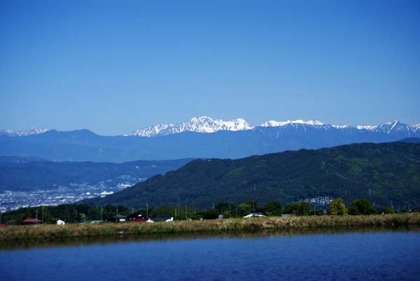 遠く残雪の穂高連峰を望む田んぼには水が入り、田植えの季節が始まろうとしている。