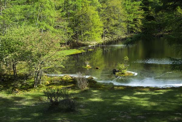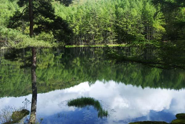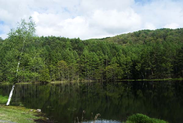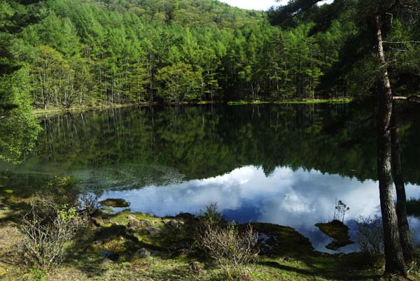 裏山の御射鹿池では湖畔の新緑が美しくなって来た。