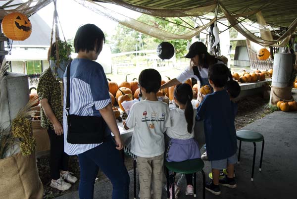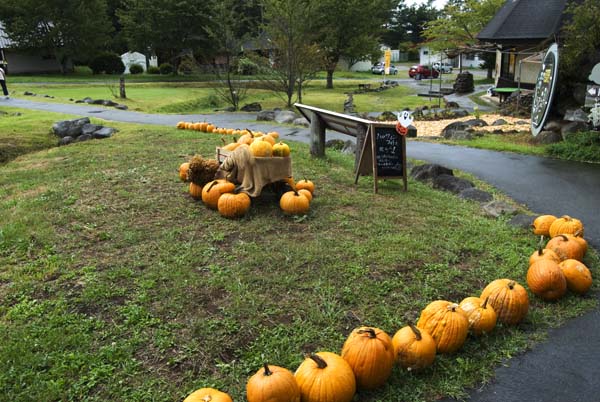 原村の八ヶ岳農場では、収穫が終わったハロウィン用のカボチャが園内に並べられている。