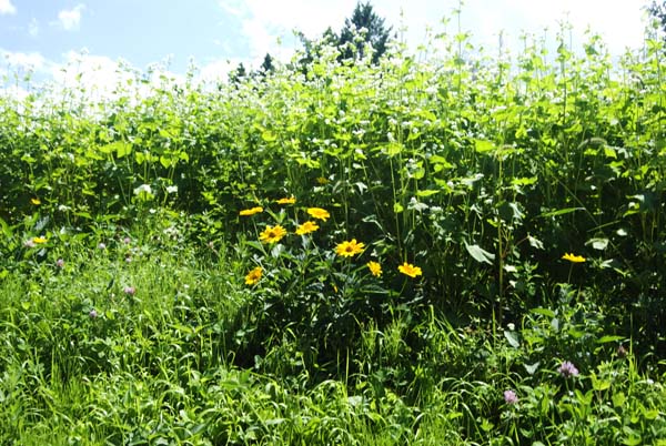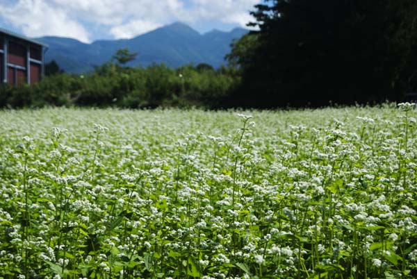 近くの畑では、蕎麦が白い花を付けて、収穫の時期を迎えている。