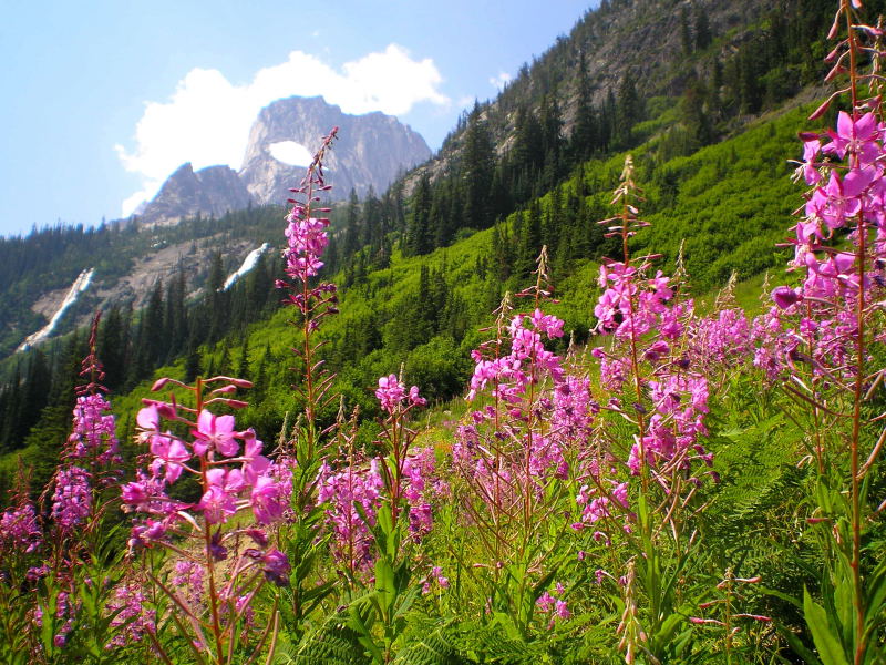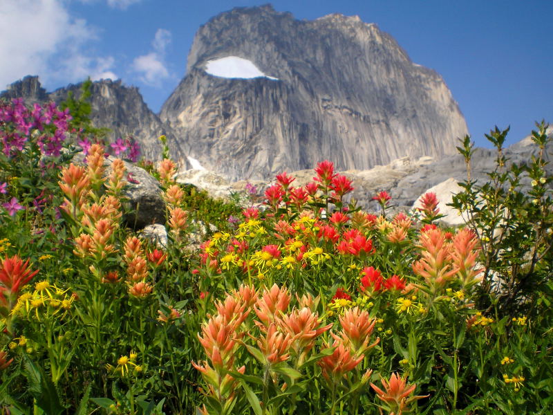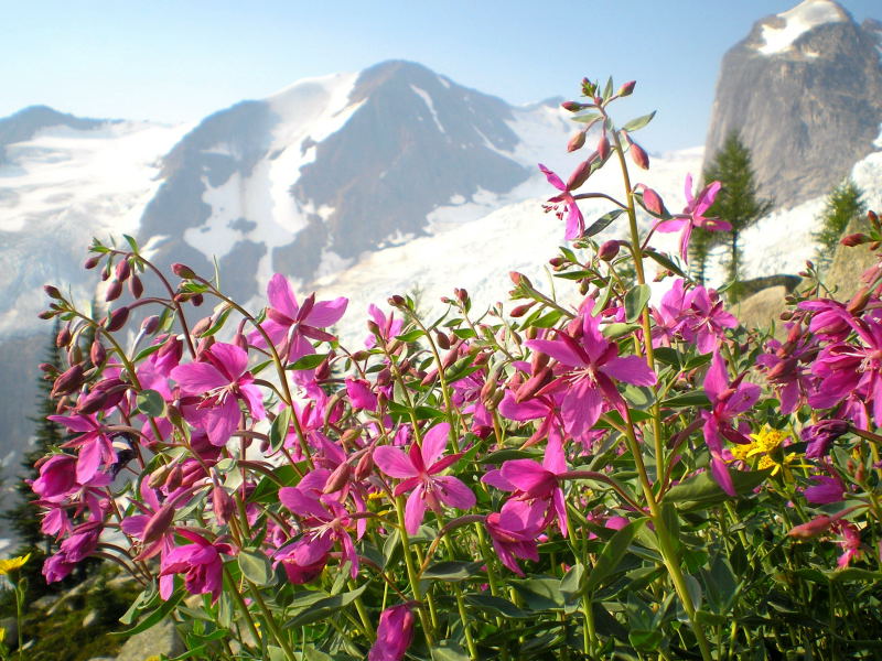 ごぶさたしています。 この週末、ブリティッシュコロンビア州のバガブウー州立公園の山に行きました。登山口まで車で4時間です。ここは花崗岩の岩山が 氷河の上に突き出し ロッククライミングのメッカです。又冬はヘリスキーでも有名。高山植物の花も今盛りでピンクのRiver Beautyや Indian Paint Brushが一面に咲いていました。