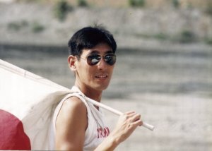 あやしい不良中年。趣味の車の競技で旗振りをやったときの写真です。